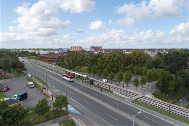 Foto: Ishøj Kommune // Visualisering af, hvordan Ishøj Strandvej kommer til at se ud, når Hovedstadens Letbane står klar i 2025.