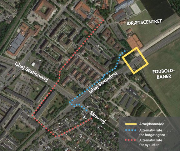 Mens arbejdet står på, er det også nødvendigt at spærre stien og tunnelen under Ishøj Strandvej. Hvis du skal krydse Ishøj Strandvej, anbefaler vi, at du benytter de øvrige muligheder for at krydse Ishøj Strandvej – f.eks. tunnelen ved Jægerbuen og Tranegilde Strandvej.